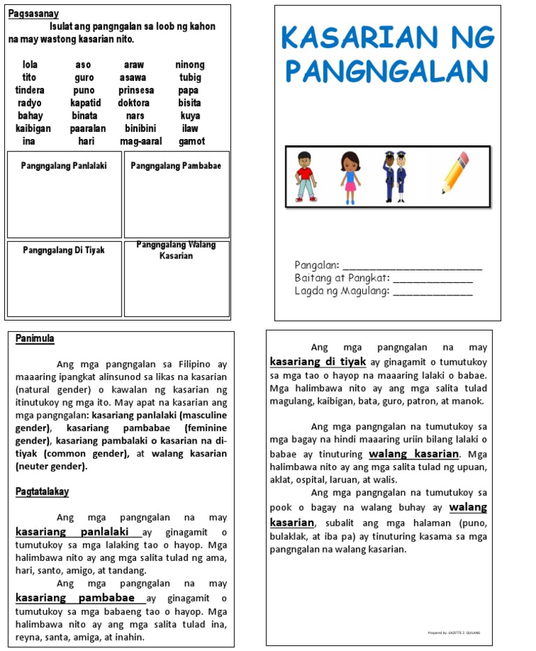 Tukuyin kung PANLALAKI PAMBABAE TIYAK WALANG KASARIAN Filipino. Aralin sa Kasarian ng Pangngalan The pdf lesson above describes the four kinds of Filipino gender kasarian nouns which are masculine nouns pangngalang panlalaki feminine nouns pangngalang pambabae common nouns pangngalang di-tiyak ang kasarian and neuter nouns pangngalang walang kasarian. _____ Tumakbo ang mga bata kanina.