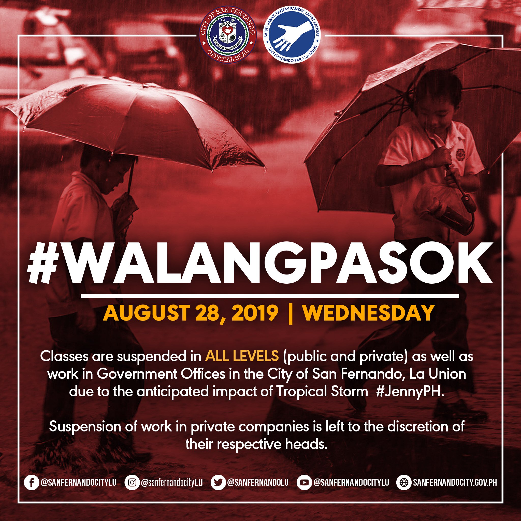 City Of San Fernando La Union On Twitter Walangpasok August 28 2019 Wednesday Classes Are Suspended In All Levels Public And Private As Well As Work In Government Offices In The